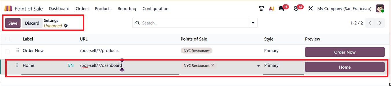 Then, you can configure home buttons of the Kiosk interface using the ‘Home Buttons’ option. This will open the dashboard of all the available buttons with their Label, url, Point of Sale, Style and Preview, as shown in the screenshot below.