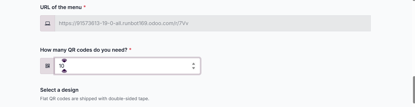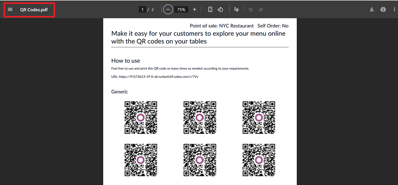 Based on the number of tables and floors in your restaurant, clicking the "Download QR Codes" button will generate and download the right number of QR codes automatically. To print them, select the "Print QR Codes" link Odoo will prepare the codes according to your table setup and download them to your system.