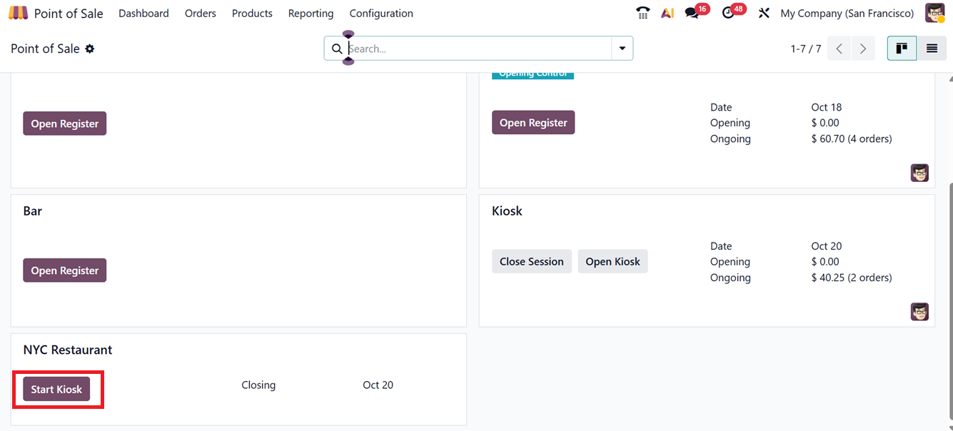 The Kiosk Interface in Odoo’s Point of Sale platform facilitates self-service ordering, significantly easing the workload on staff while improving customer experience through its interactive and intuitive design. To begin a kiosk sales session, go to the POS Dashboard Menu and select Kiosk Session.