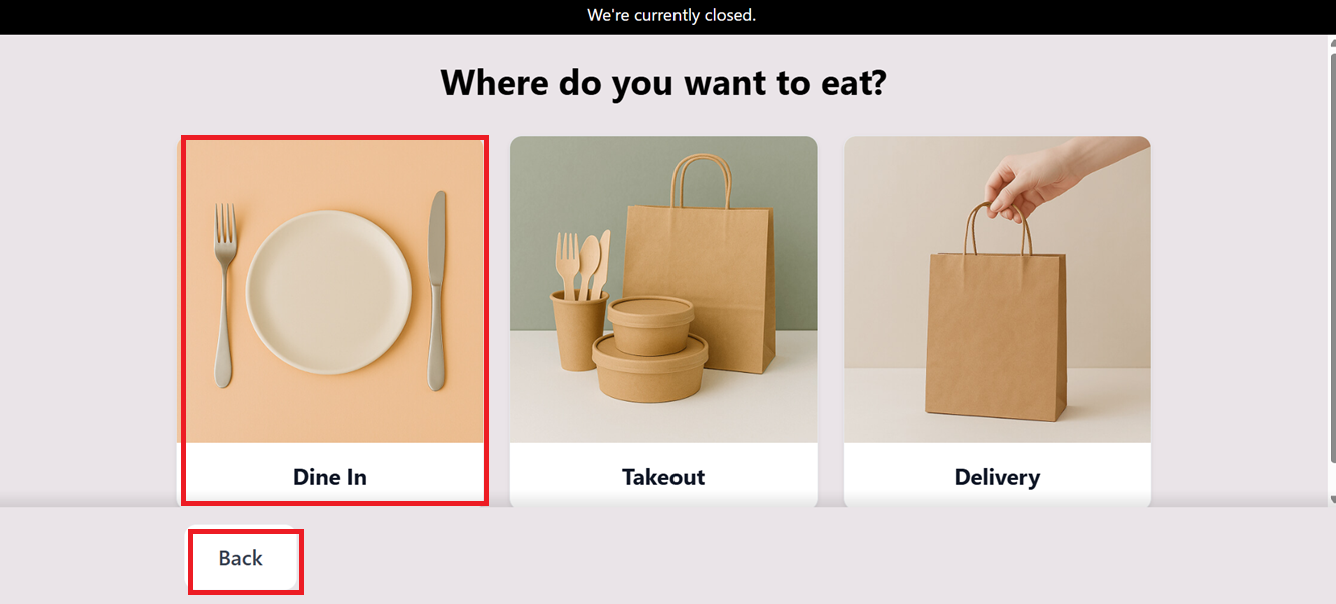 From the homepage, you have to select a preset option, such as Dine In, Takeout, and Delivery options, as shown in the screenshot below.
