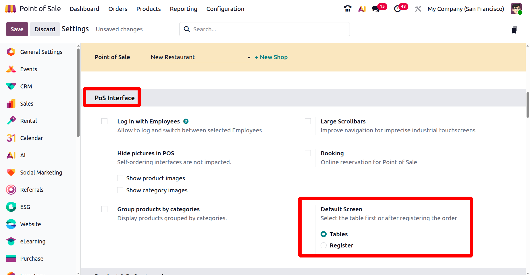 Then, you can add an additional option inside the Pos Interface, named as the ‘Default Screen.’ feature controls the initial behavior of the POS interface. It allows you to choose whether the system should prompt the cashier to select the ‘Tables’ before taking an order or ‘Register’ the order first and assign a table later, streamlining the workflow based on the restaurant or store’s operational preference.