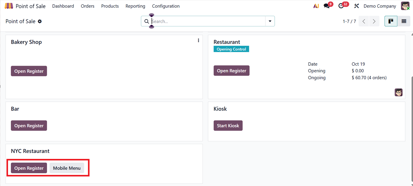 To launch a restaurant-based POS session, begin with basic configuration and proceed to adjust specific options like Sales, Taxes, Accounting, Payments, and Pricing according to your business requirements. Open the restaurant session from the POS dashboard.