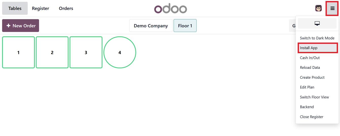 Then, you can use the POS terminal menu to install the restaurant application using the ‘Install App’ button, access Order History, manage Cash In/Out, Create Products, Backend and Close Register using the respective icons shown earlier.