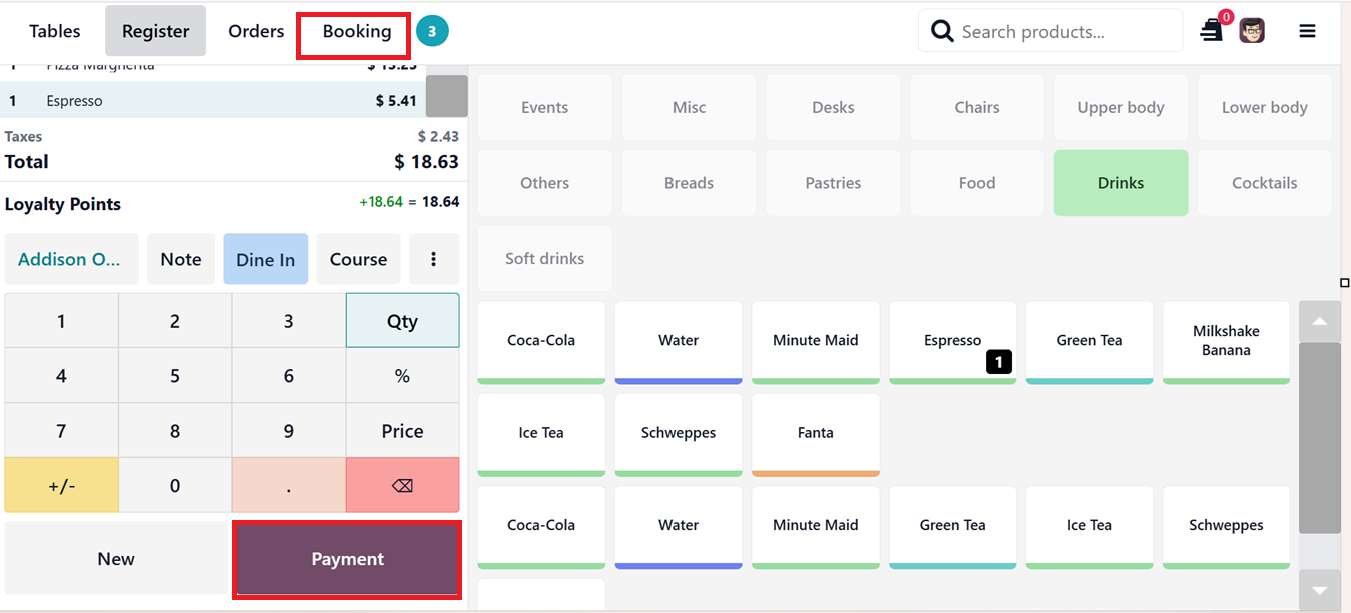 Now, pick a table from the layout, and you'll be directed to the restaurant session with all available product categories. Reserve the table by clicking the ‘Booking’ tab, as depicted in the screenshot below.