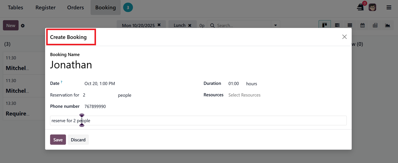 You can create new bookings using the ‘New’ button and edit the Booking Name, Date, Reservation Quantities, Phone Number, Duration and any description in the ‘Create Booking’ window, as shown in the screenshot below.