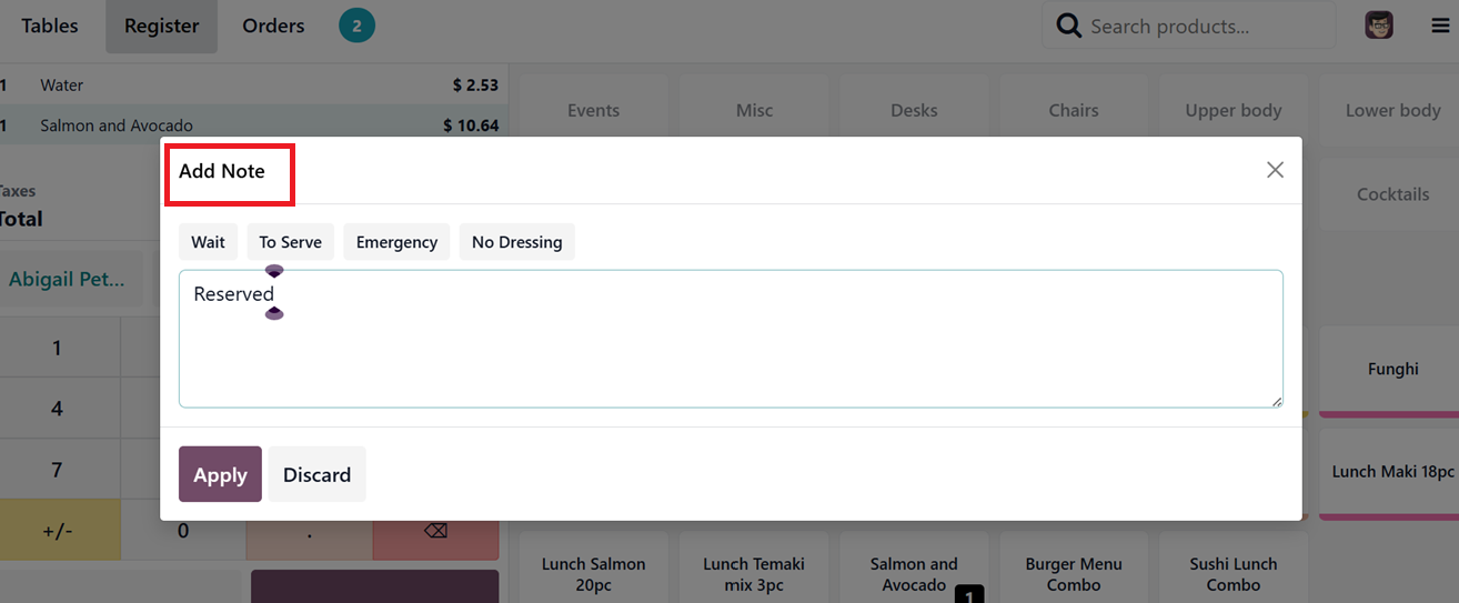 Once selected, the customer's name will appear in the sales session. To relay messages to kitchen staff, use the ‘Note’ button, which triggers a popup for writing or selecting pre-defined notes like ‘Emergency,’ ‘Wait,’ ‘To Serve’ etc. you can also create new notes using the ‘Add Note’ wizard and click on the ‘Apply’ button, as depicted in the screenshot below.