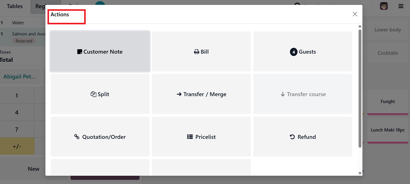 After inserting your note, click ‘Apply’. Use the ‘Action’ (Three vertical dotted)menu to access additional functions like adding a Customer Note, creating a Quotation/Order, Splitting Bills, entering Promo Codes, checking Transfer/Merge Orders, Switching Pricelists, initiating Refunds, changing to Takeaway Orders, or Cancelling Orders, as shown in the screenshot.