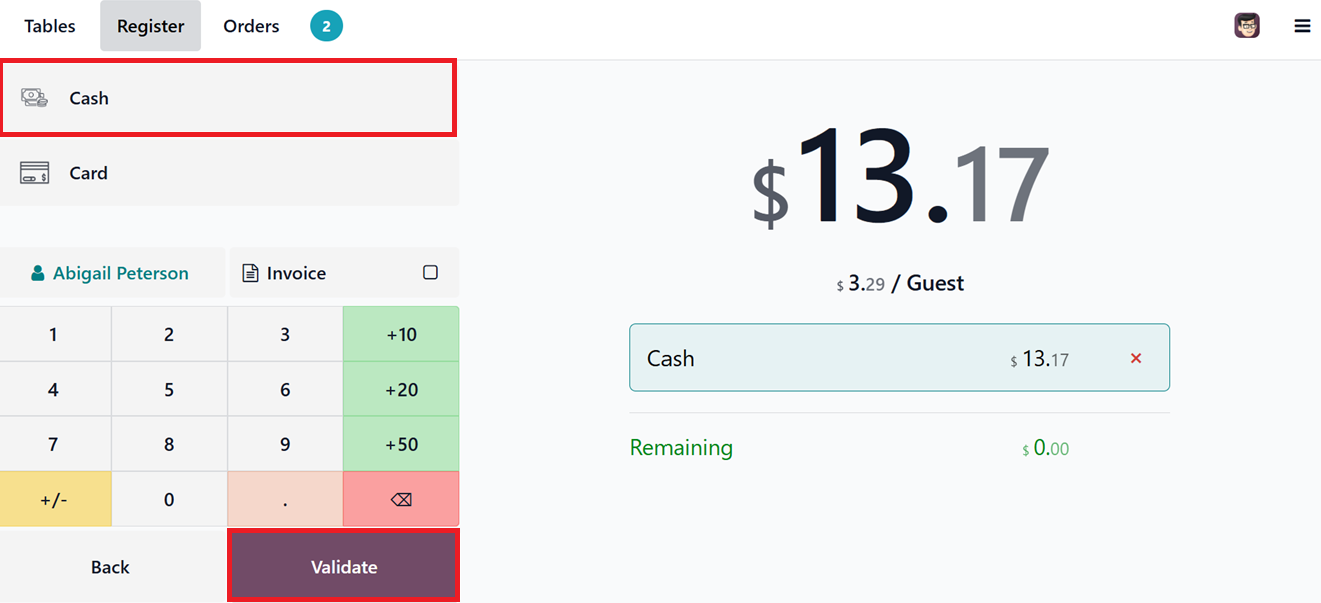 For instance, choosing ‘Cash’ will reflect it on the screen. Also, you can add a tip using the +10, +20, or +50 buttons. Complete the payment by pressing the ‘Validate’ button. Upon validation, a confirmation screen appears showing a preview of the receipt, as illustrated.