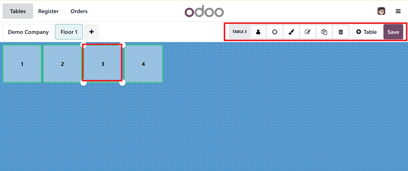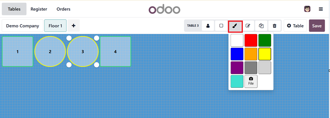 While changing the color and shape of a table, you can also add any image of the seats using the ‘File’ icon provided in the color selection field. After saving, the revised layout is displayed and you can continue with the sales process.