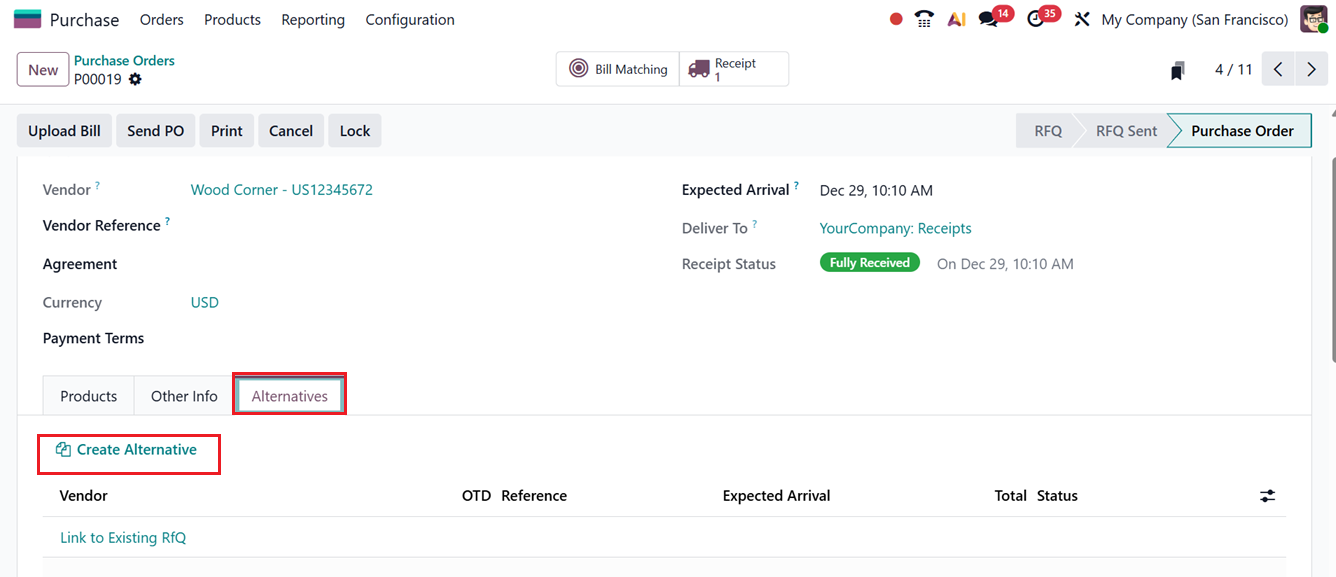 After enabling the feature, you can check the functionality within a purchase order, the Alternatives tab will allow you to compare and manage multiple RFQs for the same product from various vendors. By using the Create Alternative button, you can generate additional RFQs quickly, simplifying vendor comparison and improving sourcing efficiency, as depicted in the screenshot below.
