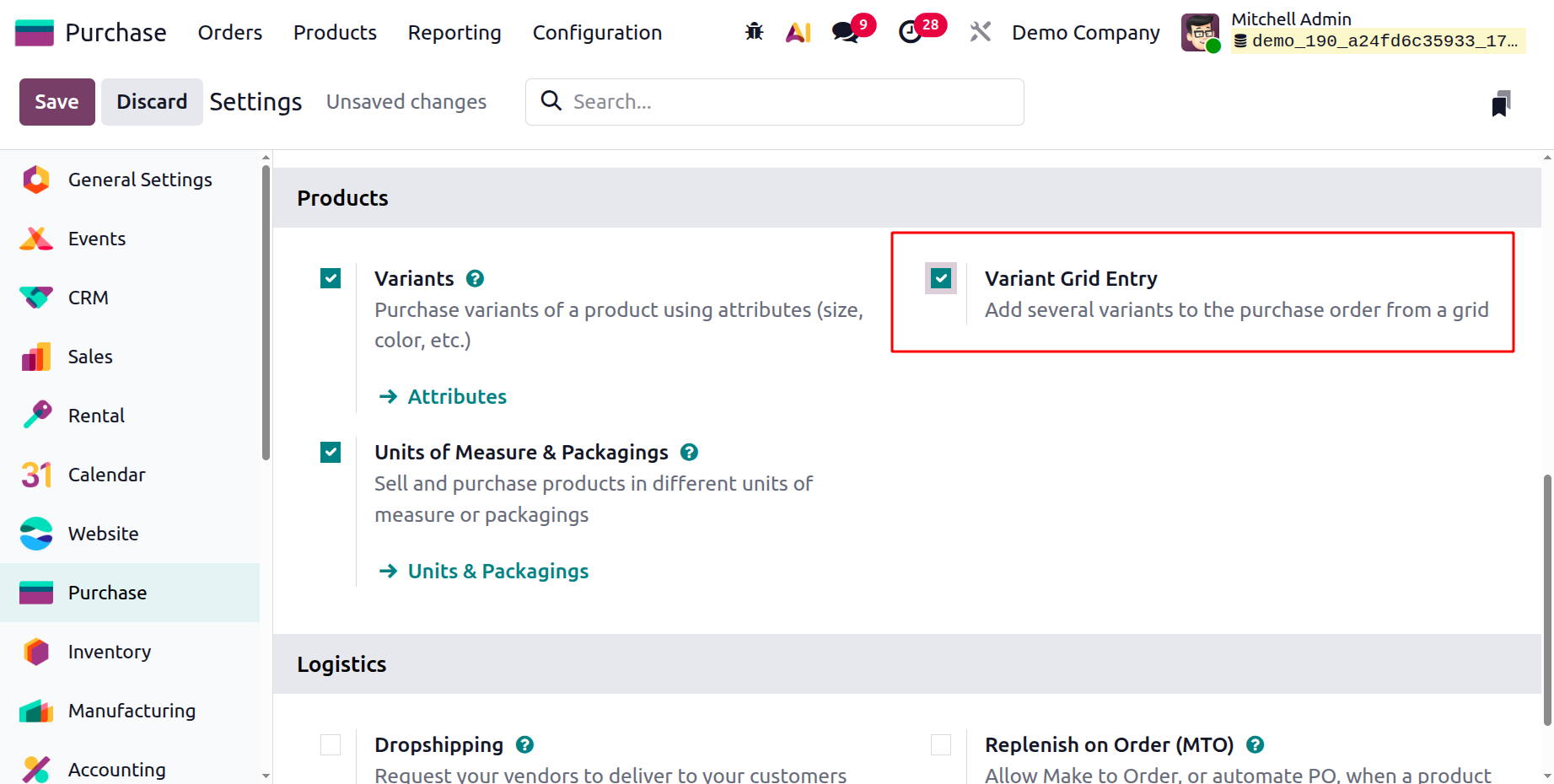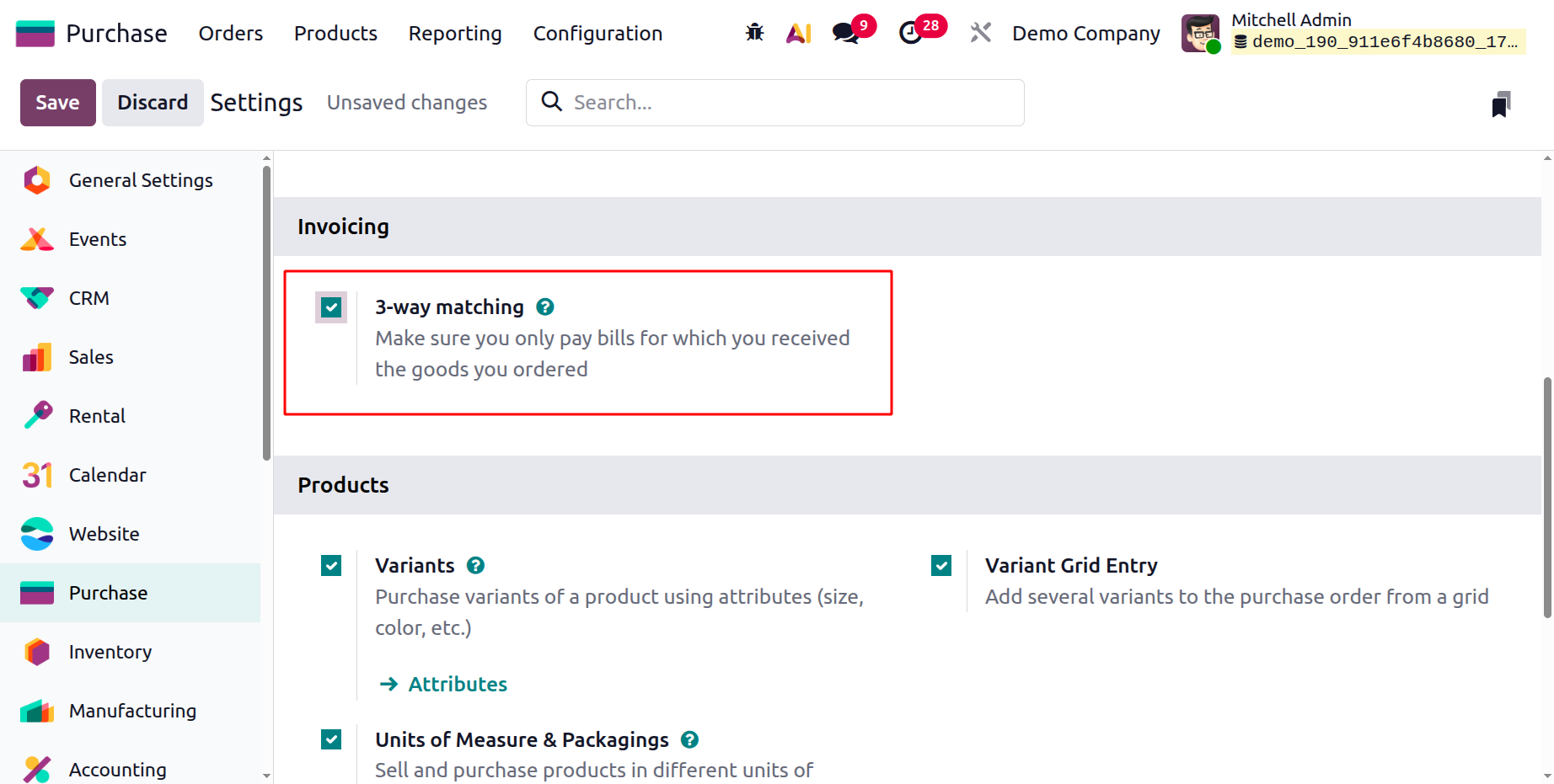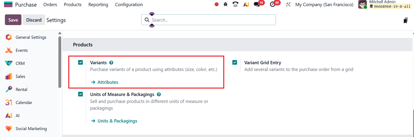 To configure this feature in your Purchase Module, enable the ‘Unit of Measures & Packagings’ option inside the ‘Products’ tab of the general ‘Settings’ window, as shown in the screenshot below.