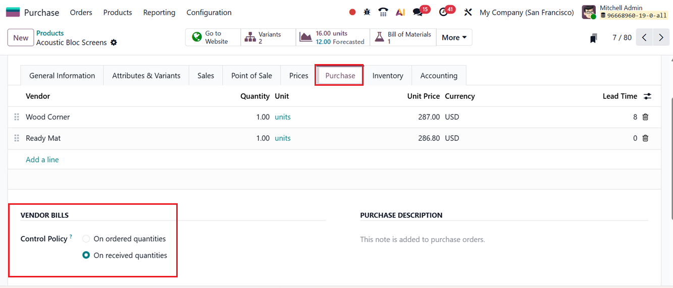 To activate this feature, set the Bill Control policy to ‘On received quantities’ in the Settings or within the product configuration. This can be done inside the Purchase tab of the form, as shown in the screenshot below.
