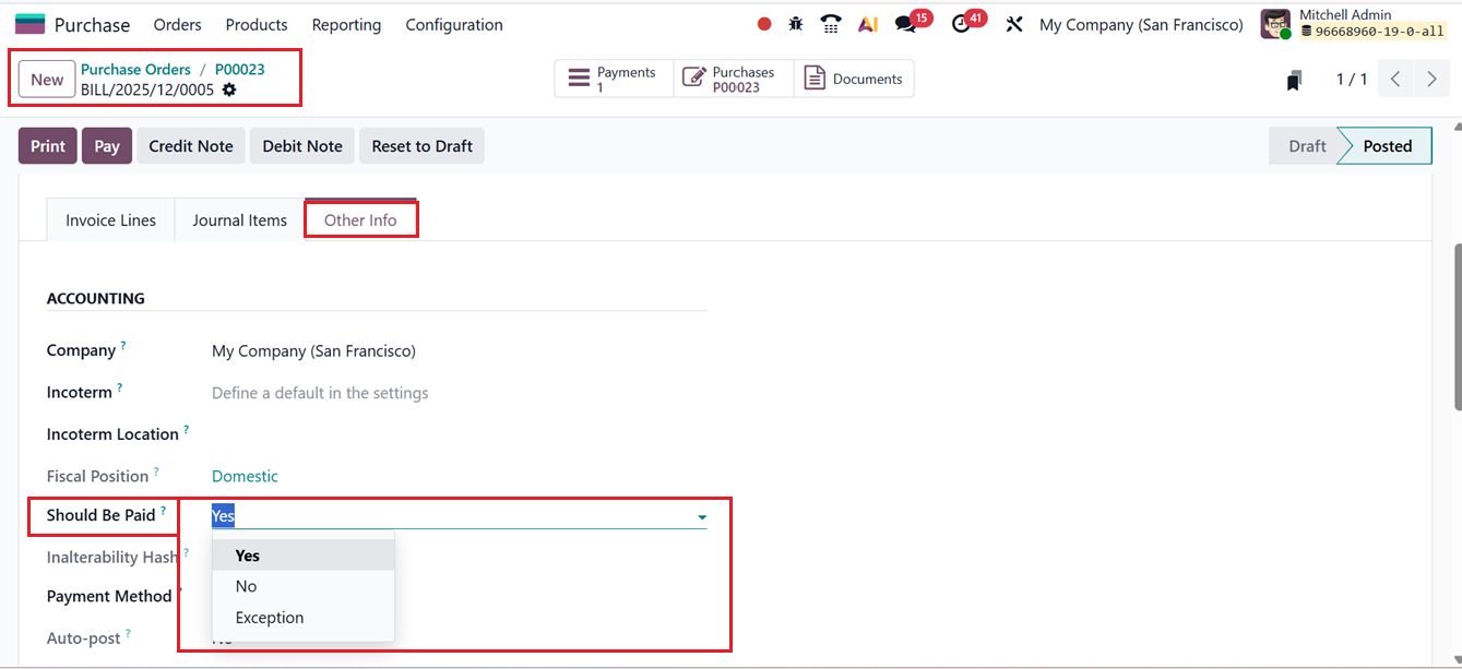 Once a purchase order is created and confirmed, and the products are received, Odoo updates the vendor bill accordingly. In the Other Info tab of the bill. The Should Be Paid field indicates the system’s evaluation, as shown in the screenshot below.