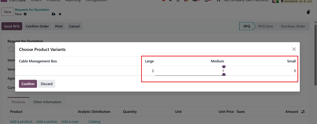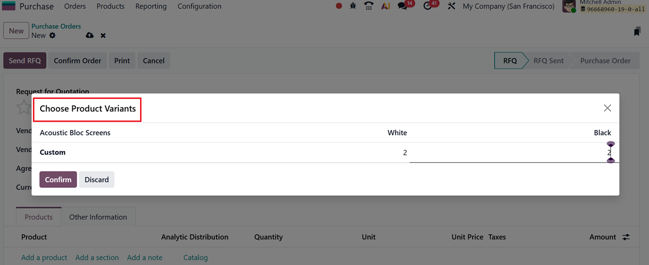 When creating a Request for Quotation (RFQ) or a Purchase Order, users can select the required product variant from the Products tab using the variant grid selection option, as illustrated below.