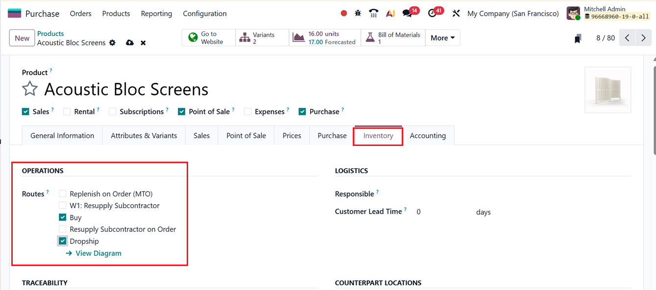Once this option is enabled, users can navigate to the Inventory tab within the product form and configure the product’s Routes by selecting “Dropship”, as demonstrated in the screenshot below.