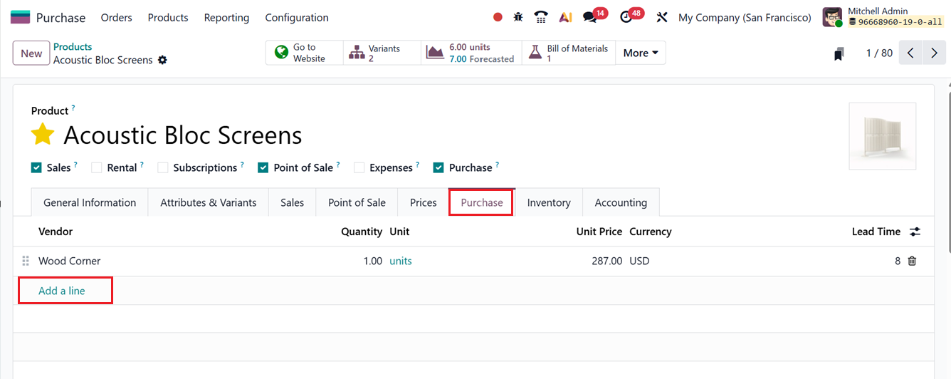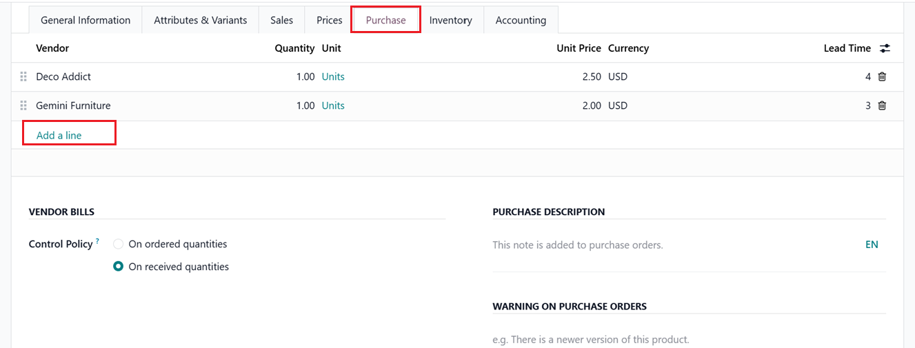 The Vendor Pricelists option allows businesses to maintain different pricing rules for products depending on the supplier. After enabling this setting, users can create vendor-specific prices from the Purchase tab within the product form.
