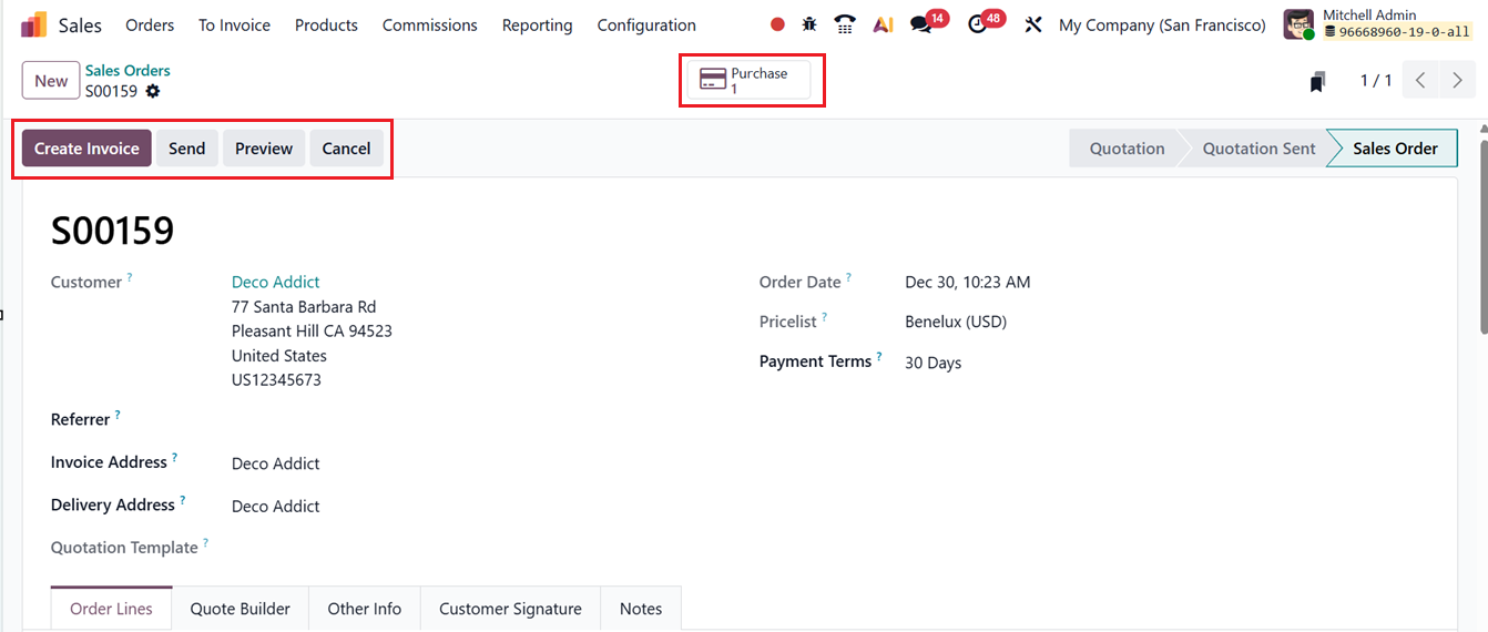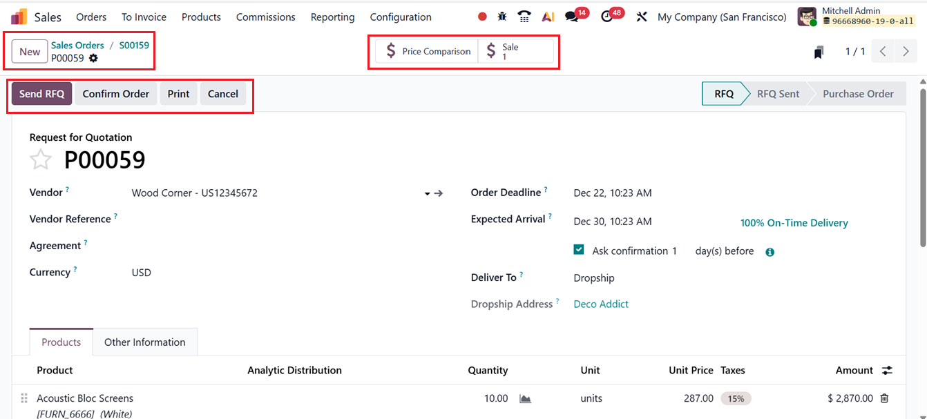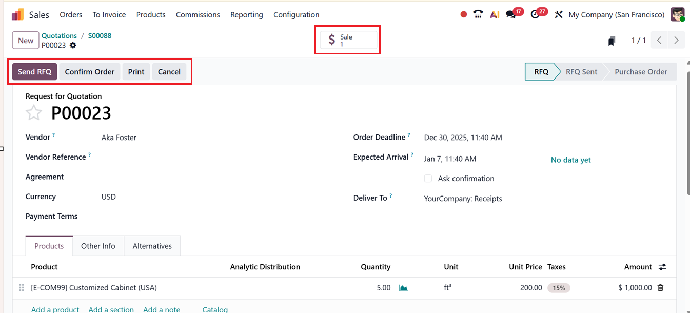 Once the sales order is confirmed by clicking the Confirm button, Odoo automatically generates a linked Purchase Order for the same product and assigns it to the corresponding vendor. This automatically created purchase order can be accessed through the Purchase smart button available on the sales order form, as depicted in the screenshot below.