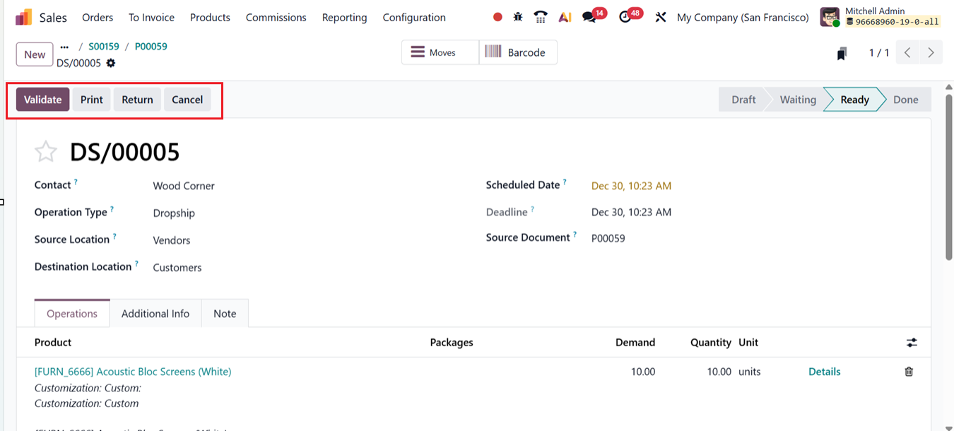 After the purchase order confirmation, the supplier initiates the shipping process. Odoo tracks and records each step automatically, ensuring complete operational transparency. By opening the Dropship smart button, you can review the shipment details and validate the dropship operation by clicking the Validate button, thereby confirming that the product has been successfully delivered to the customer.