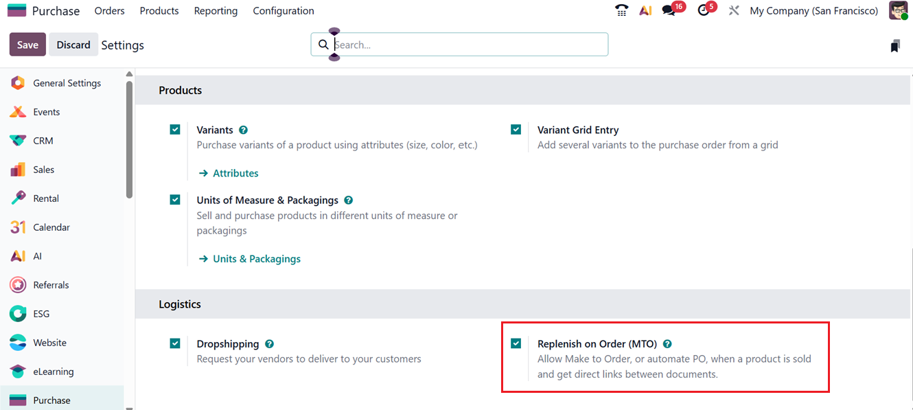 To use this feature, enable the ‘Replenish on Order (MTO)’ option under the ‘Logistics’ section from the Configuration ‘Settings’ page, as shown in the screenshot below.