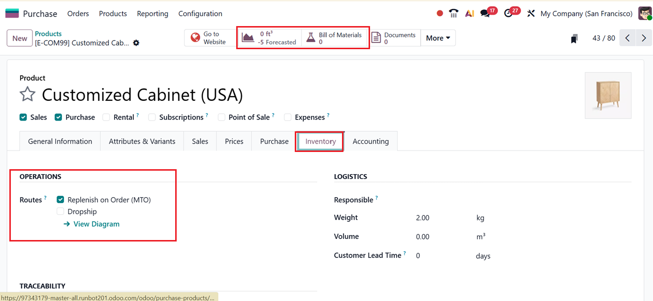 The Replenish on Order (MTO) feature allows purchase orders to be generated automatically as soon as a sales order is confirmed. To illustrate this process, consider a product called “Customized Cabinet” This item is not stored in inventory, meaning there is no available stock. When reviewing the product form, no Bill of Materials (BoM) is defined, confirming that it is neither manufactured nor pre-stocked.