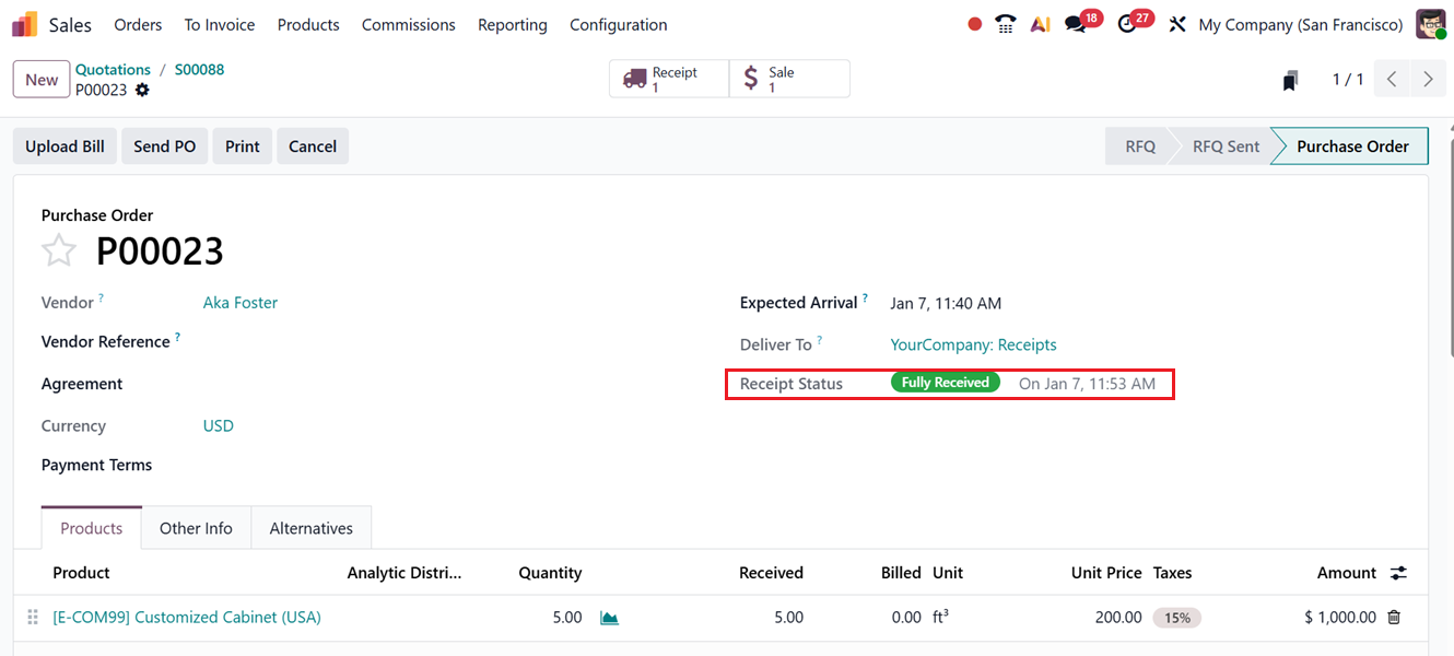 Then you can confirm the order using the ‘Confirm Order’ button. This will display an ‘Receipt’ smart button and the product receipt is validated within the receipt form, bringing the items into the company’s inventory, as shown in the screenshot below.