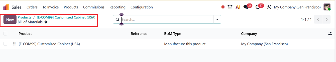 To check the workflow, open the same product, Customized Cabinet(USA). The on-hand quantity remains zero, indicating that the product is not stocked. On the product form, there is a smart tab labeled Bill of Materials. Upon opening this tab, you can see the available Bill of Materials for the product in a dashboard. To create a new one, you can click on the New button.
