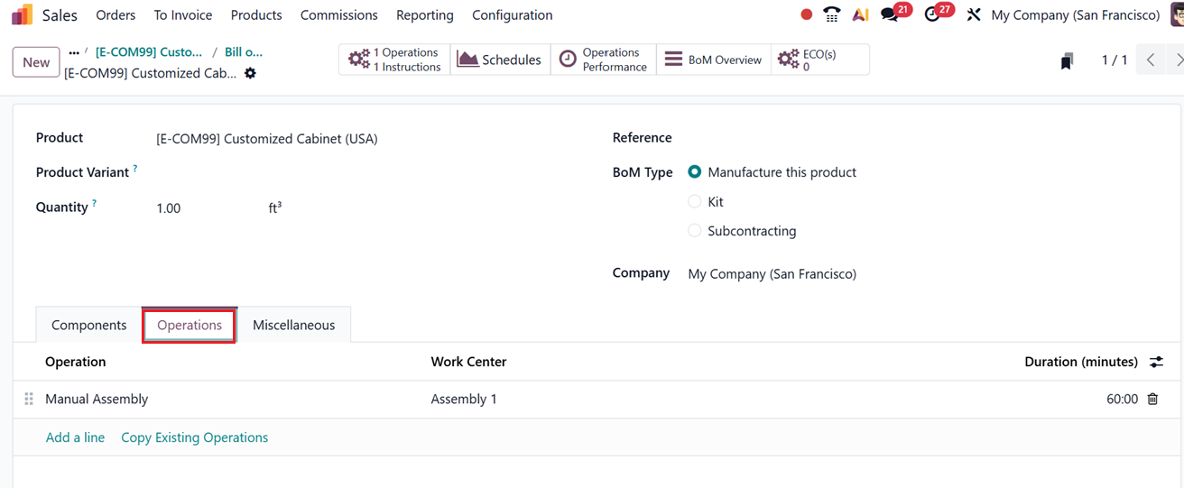 Next, move to the Operations tab and add the necessary operations involved in producing the product. These operations represent the manufacturing steps that must be performed during production. Once the components and operations are configured, save the Bill of Materials.