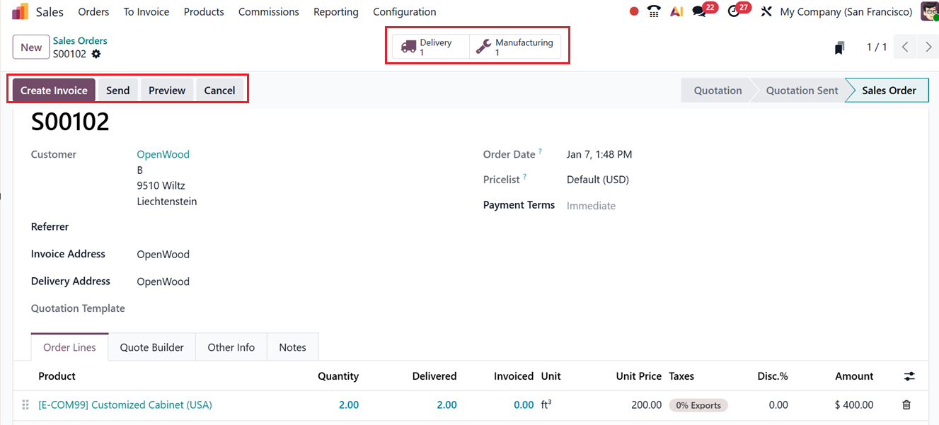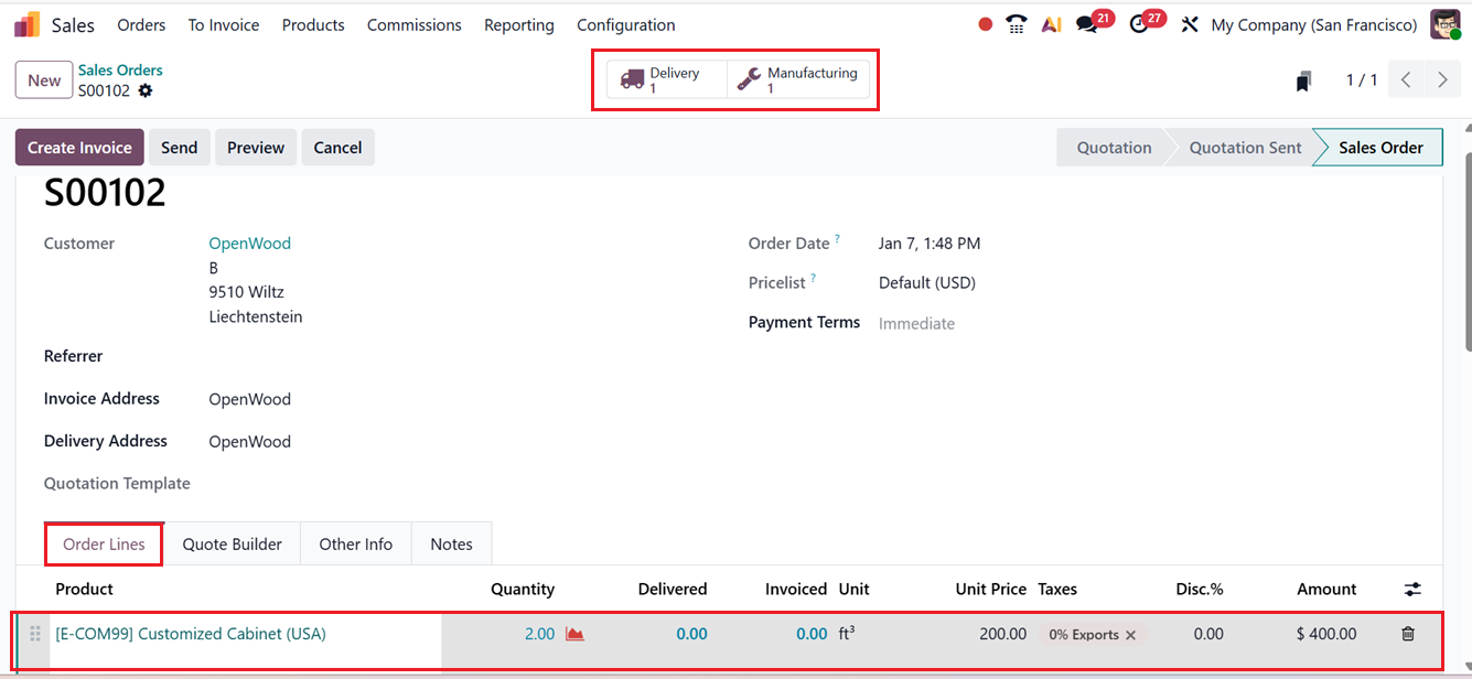Now, create a new sales order for the product Customized Cabinet(USA) from the Sales module. Add the product to the order line with a quantity of two units, then confirm the order. As in the earlier scenario, two smart tabs appear on the sales order. A ‘Delivery smart tab and instead of a Purchase Order, the second smart tab is now Manufacturing, indicating that a Manufacturing Order has been generated, as shown in the screenshot below.