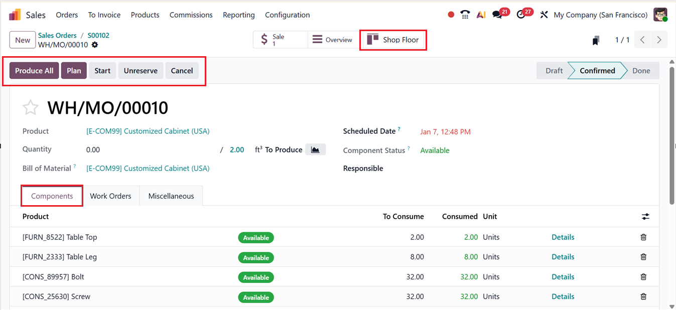 Open the Manufacturing Order from the smart tab. The system automatically displays the Components and Operations defined in the Bill of Materials. Here, you can plan the manufacturing order for a suitable timing using the ‘Plan’ button or immediately start the production process using the ‘Start’ button. Once production is complete, click on Produce All to finish the manufacturing operation, as shown in the screenshot below.