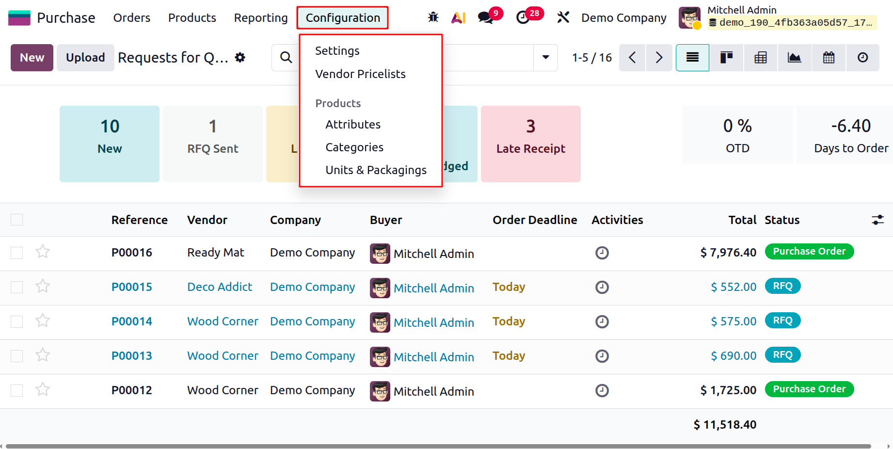 The ‘Configuration’ menu of the Odoo 19 Purchase Module lets you manage the general Settings, Vendor Pricelists, Attributes, Categories and Units & Packagings. Now, let’s discuss them in detail.