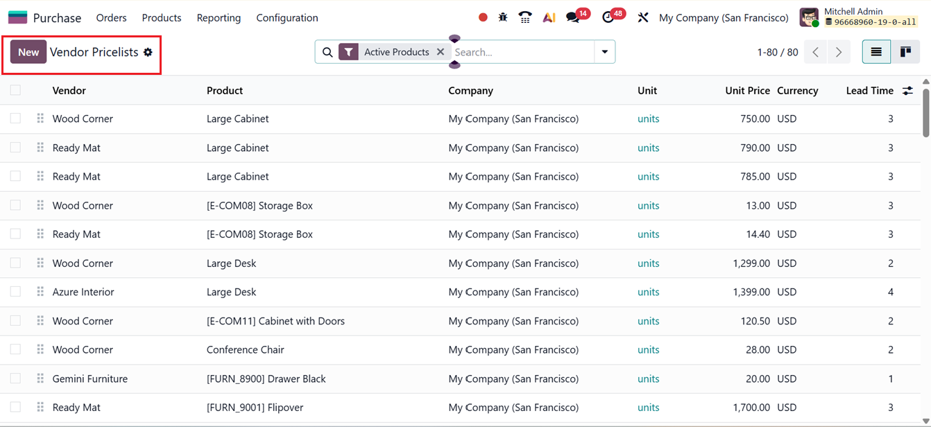 Within the Configuration menu, you will find the Vendor Price Lists option. Selecting this opens the Vendor Price Lists window, which displays a structured list view containing critical information such as Vendor, Product, Company, Unit, Unit Price, Currency and Lead Time, as shown in the screenshot below.