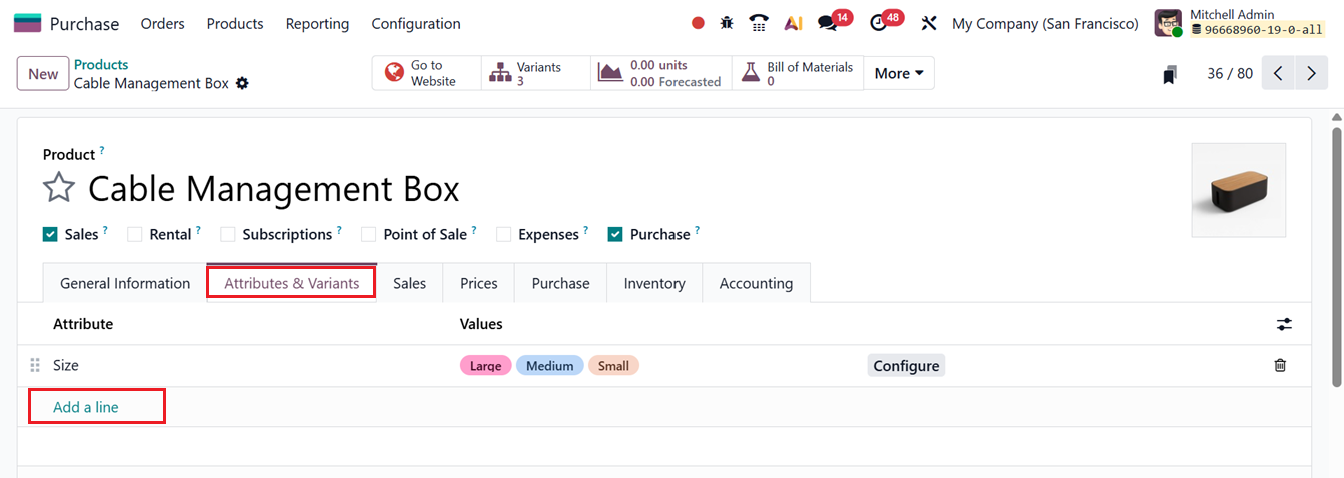 These attributes can then be linked to specific products. Open the product configuration form and navigate to the Attributes & Values tab. Use the Add a line button to assign the desired attributes and values, as shown in the screenshot below.