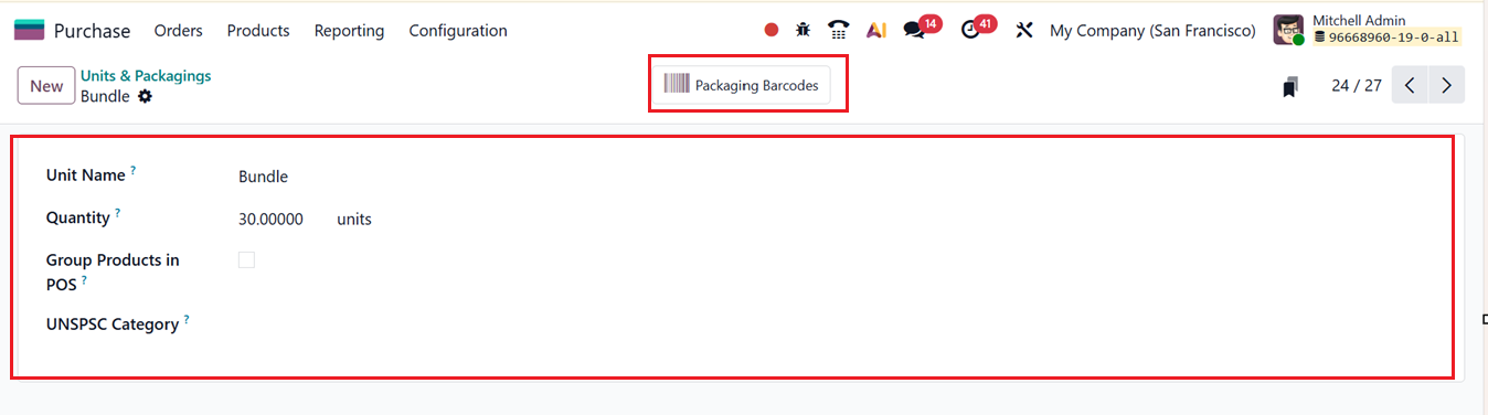 Once all required information is entered, save the record to make the new unit of measure or packaging available for use. The ‘Packaging Barcode’ smart button can be used to manage and access barcode information related to a product’s packaging. Its main function is to link barcodes to specific packaging units so they can be recognized during purchasing and inventory operations.