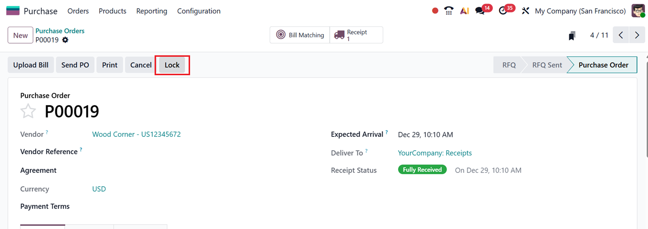 This prevents accidental or unauthorized changes to key procurement details such as vendor information, quantities, or pricing. You can Lock or Unlock orders via the corresponding buttons in the purchase order form, as depicted in the screenshot below.