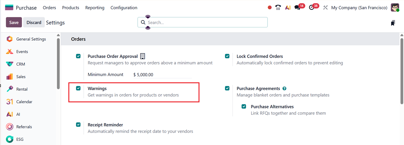 Warning Messages: The Warning Messages feature provides an extra layer of caution when dealing with certain vendors or products. Once the Warnings option is enabled from the Purchase module settings, alerts or blocking messages can be configured for both products and vendors.