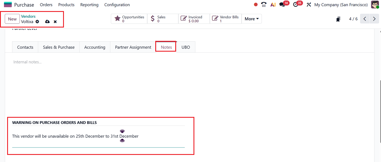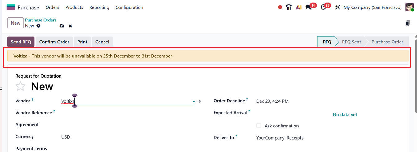 Whenever a purchase order involves a vendor or product with a warning, Odoo automatically displays the alert to notify users of potential concerns, as shown in the screenshot below.