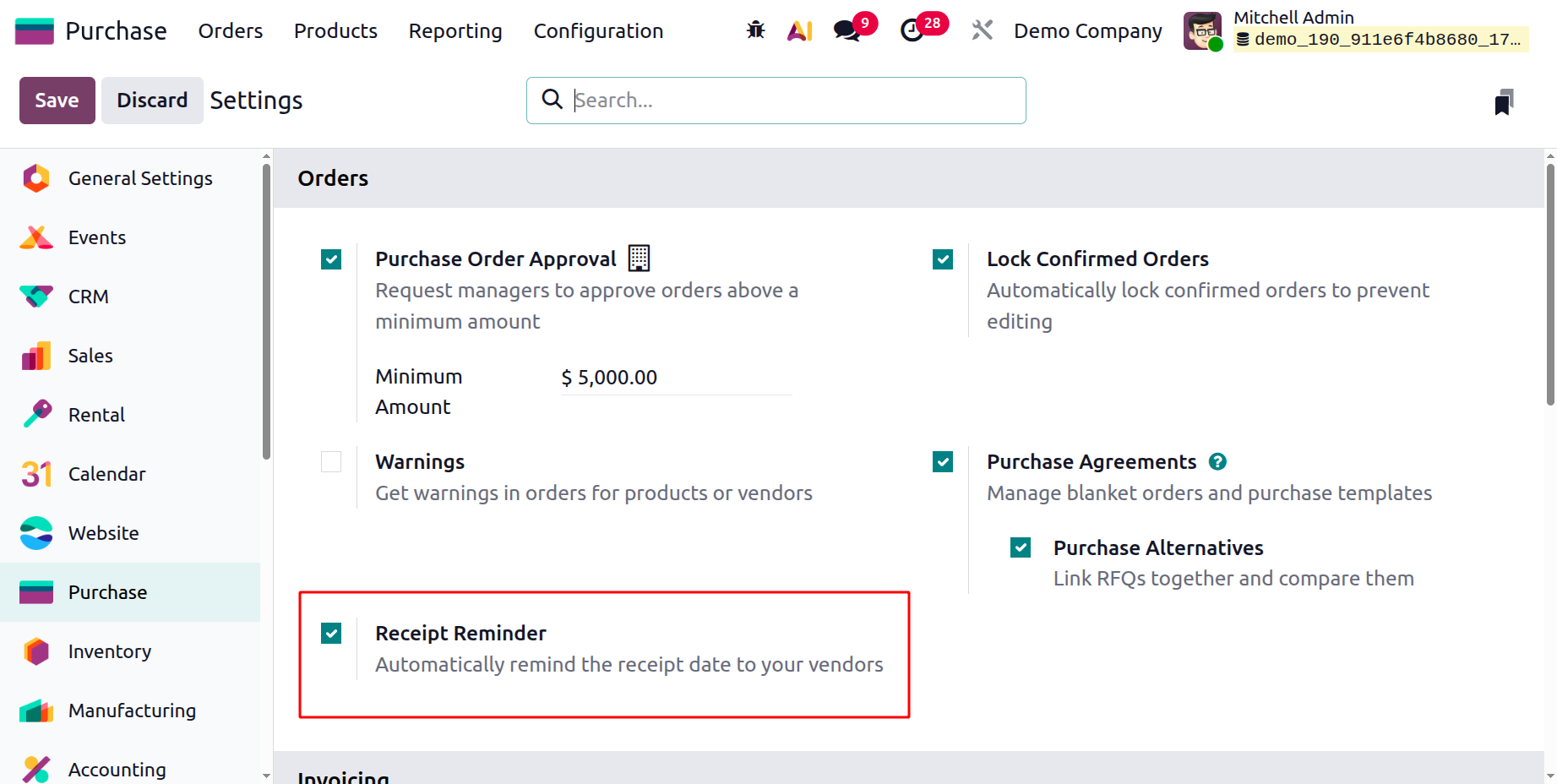 Receipt Reminders: Activating the Receipt Reminders enables Odoo to send automated notifications to vendors regarding expected delivery dates. These reminders help maintain smooth communication, reduce delays, and improve coordination between the company and its suppliers.