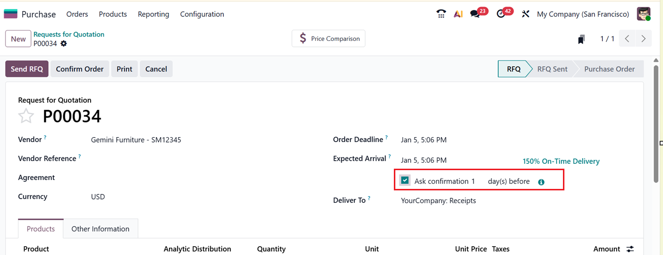 Enabling the ‘Receipt Reminder’ option will display an ‘Ask Confirmation’ button inside every RFQ Order creation form. This will automatically send a mail to the vendor ‘x’ days before the expected receipt date to ask them to confirm the exact date. You can set the number of days as per your preference, as shown in the screenshot below.