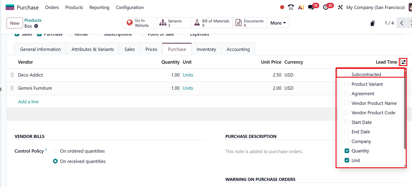 Vendors can be chosen from the existing contact list or created as new entries. Additional options available at the upper-right corner of this tab allow the creation of custom fields for more vendor-specific purchase information. If a vendor also serves as a subcontractor, the ‘Subcontracted’ option can be activated. Subcontracting processes and corresponding configurations are further detailed in the Manufacturing module.
