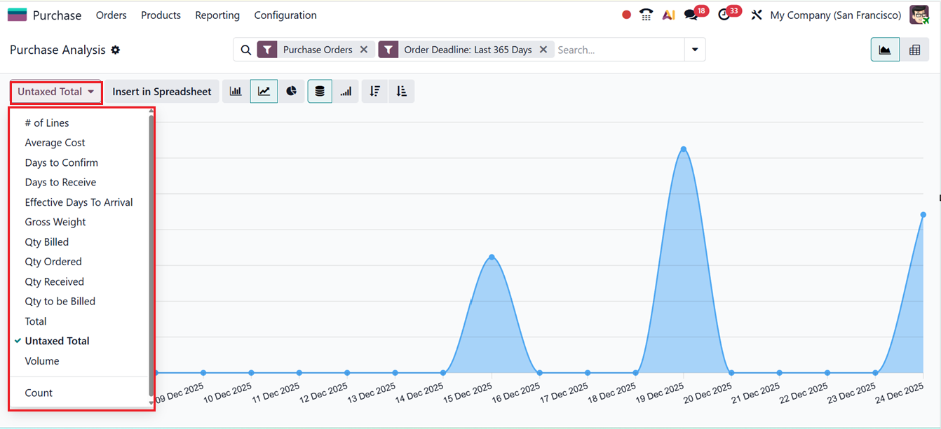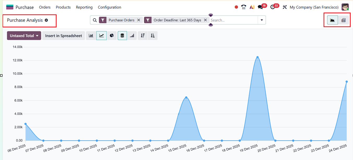 In Odoo 19, the Purchase module includes a powerful reporting framework that allows organizations to thoroughly analyze procurement activities. Accessible from the Reporting menu, the Purchase Analysis dashboard provides an interactive interface for generating reports across multiple time periods, such as daily, monthly, or yearly, enabling informed evaluations of purchasing trends.