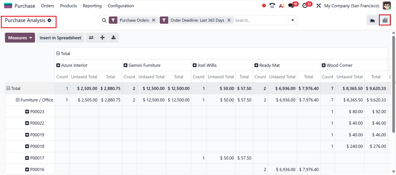 You can further refine reports using built-in filters such as Requests for Quotation, Purchase Orders, Order Deadline and Confirmation Date. Custom filters can also be created to satisfy specific analytical requirements using the ‘Custom Filter’ option.