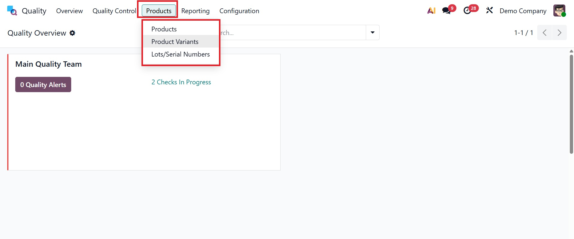 Products, product variations, and lot/serial numbers are defined on the Product tab of the Odoo 19 Quality module. Select the Products menu from the Products tab to purchase everything your business sells. Each product's price, stock level, internal reference, and other details are displayed on the Kanban screen. By selecting the product from the Products window, the user can see all of its details.