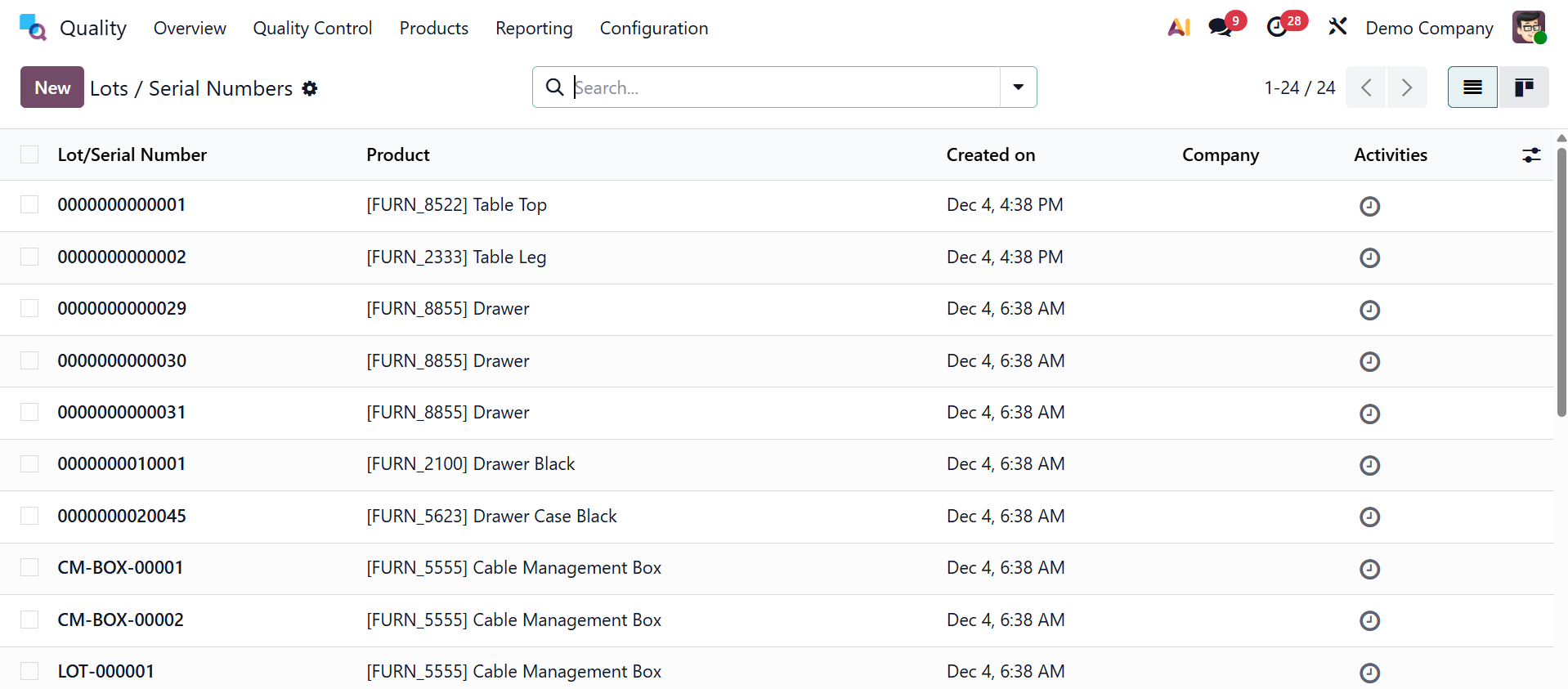 Products are assigned lots or serial numbers as they are being manufactured. Each product in a corporation has a distinct number that distinguishes it from the others. By choosing the Lot/Serial Numbers option under the Items menu, a user can see all created serial numbers for products in a company. Users can examine details about each commodities lot/serial number, including Product, Company, Created Date, etc. By selecting the New button, a product can be assigned a new lot or serial number.