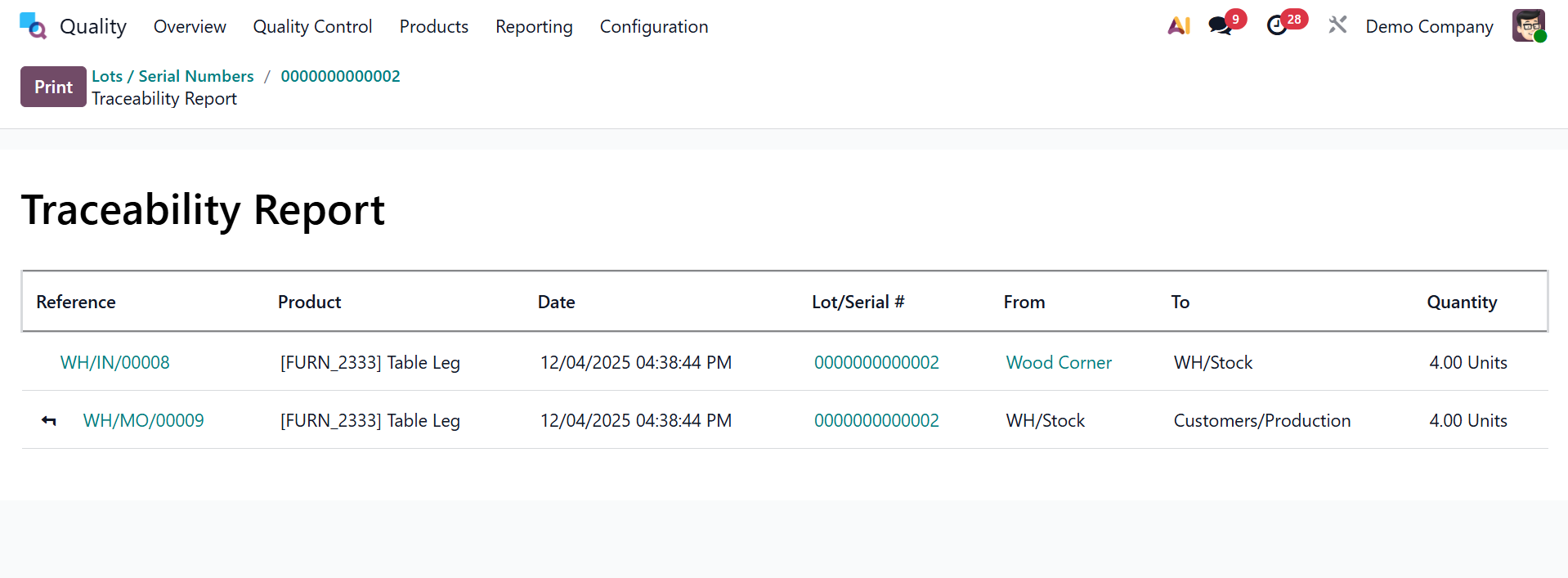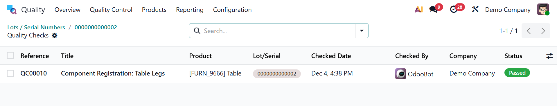 - Quality Check Smart Button – Displays the linked quality check record where inspection results, control points, and pass/fail status are recorded.