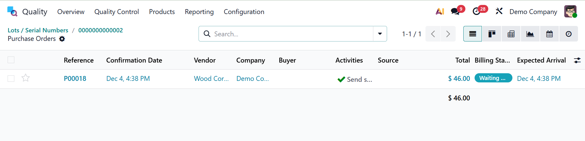 - Purchase Smart Button – Opens the related purchase order from which the quality check was created, allowing traceability to the original vendor transaction.