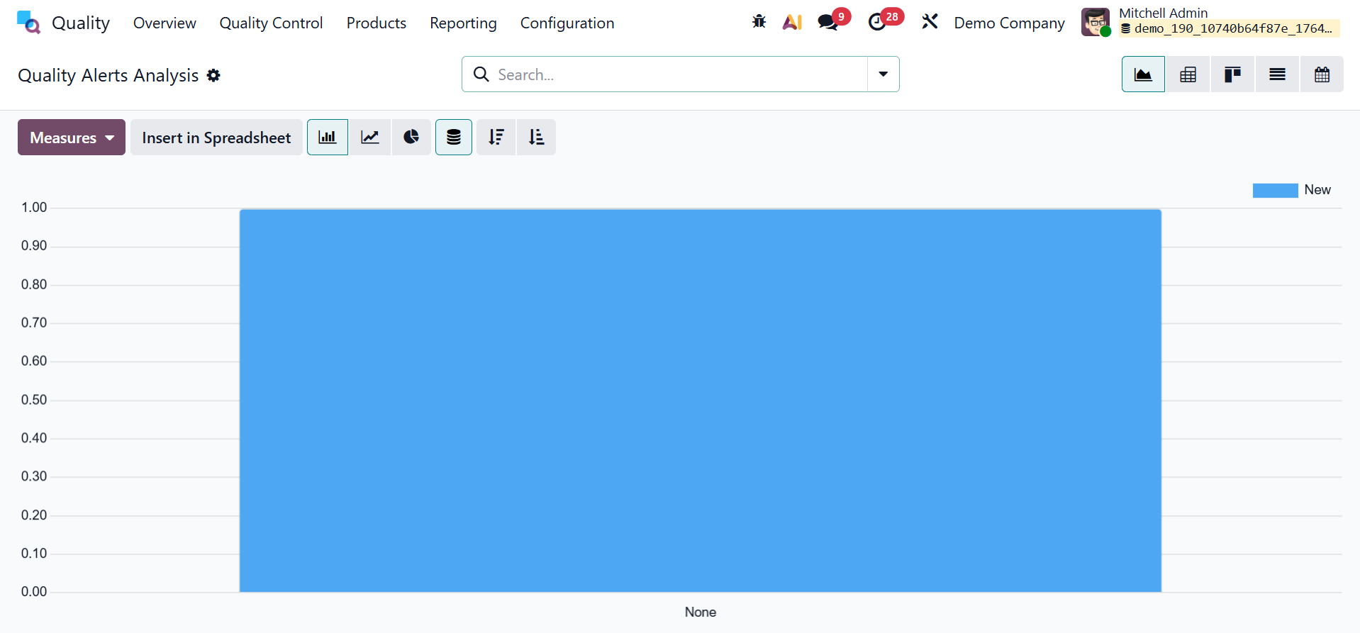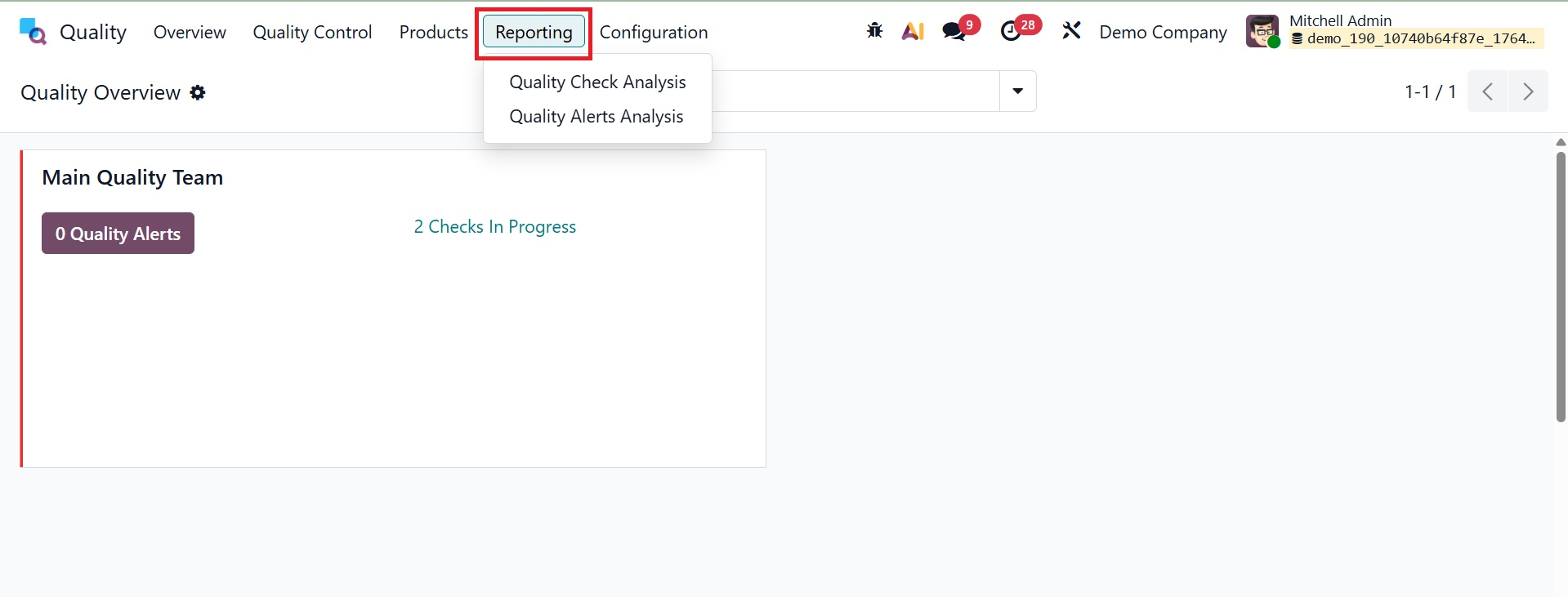 Odoo 19 offers several reporting options for each module based on the logged actions. Quality Check and Quality Alert reports are displayed by the Odoo 19 Quality module's reporting capability.
