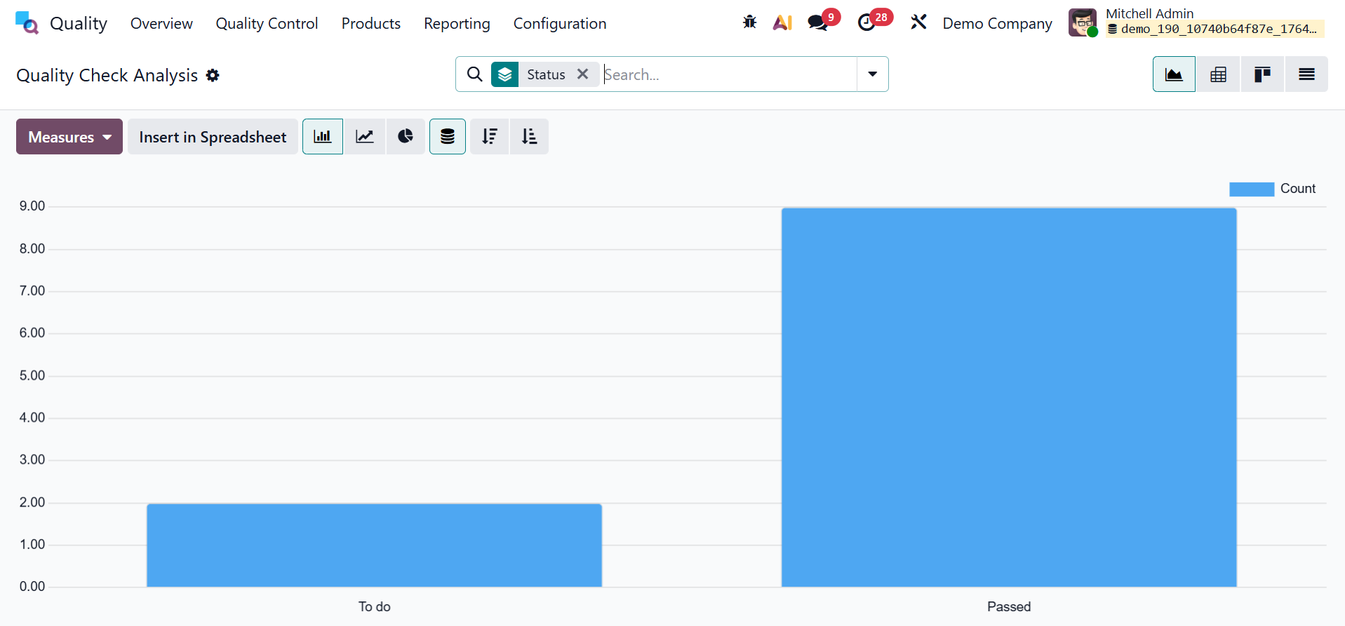 To open a new window with a graphical representation of the quality check status, select Quality Checks from the Reporting menu. The graph view shows count data on the Y-axis and status data on the X-axis. Plotting various measures on graphical displays allows customers to review quality checks. By choosing the Measures icon, we may interact with values like Done, Measure, Finished Product Sequence Number, and Quantity Tested.