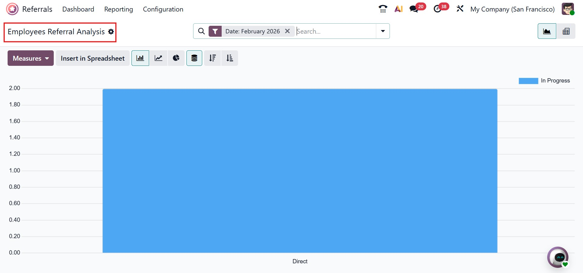 The Referral module includes a powerful reporting feature that helps businesses analyze employee referral performance in detail. When you select the Reporting menu in the Odoo 19 Referral module, the Employee Referral Analysis window opens.