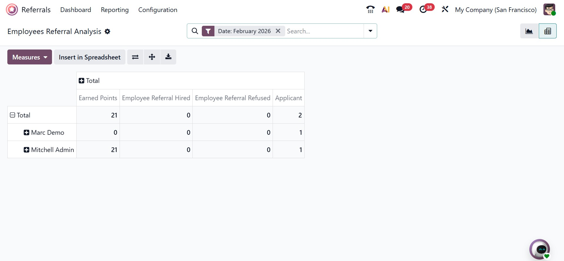 In this window, the Pivot view displays referral data in a structured pivot table format. The table shows important details such as points earned by each employee, successful hires through referrals, rejected referrals, and applicant-related information. By clicking the Measures button, users can add more values to the pivot table, including referral count, points awarded for unsuccessful applications, and other useful metrics.