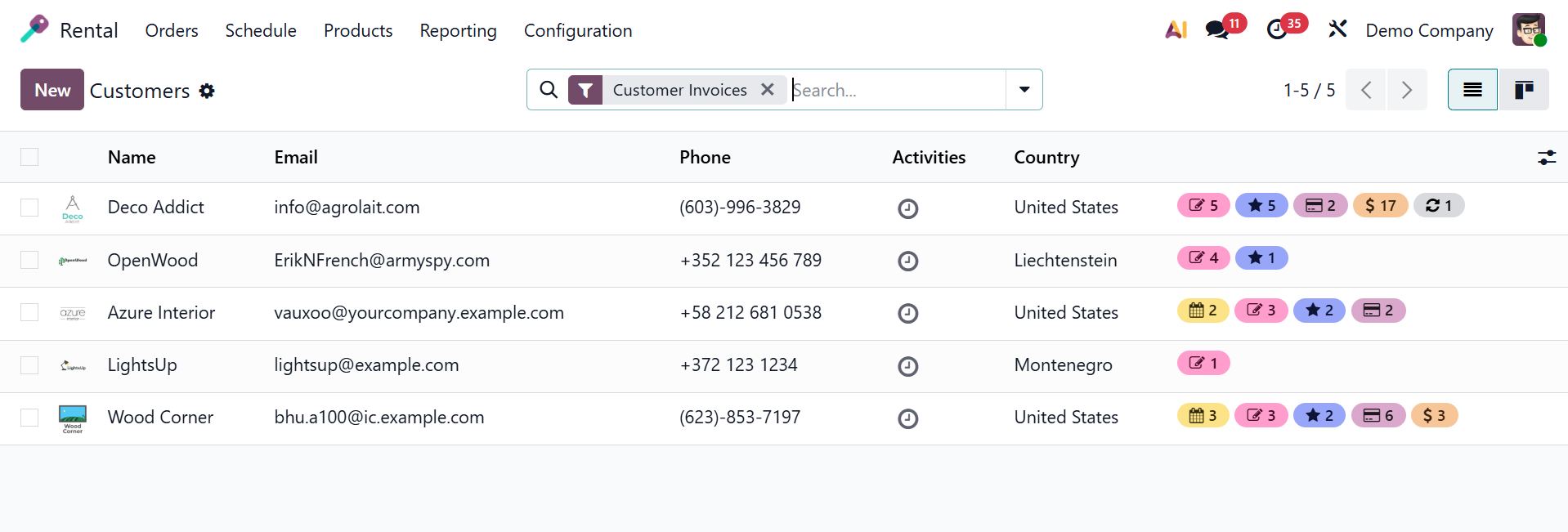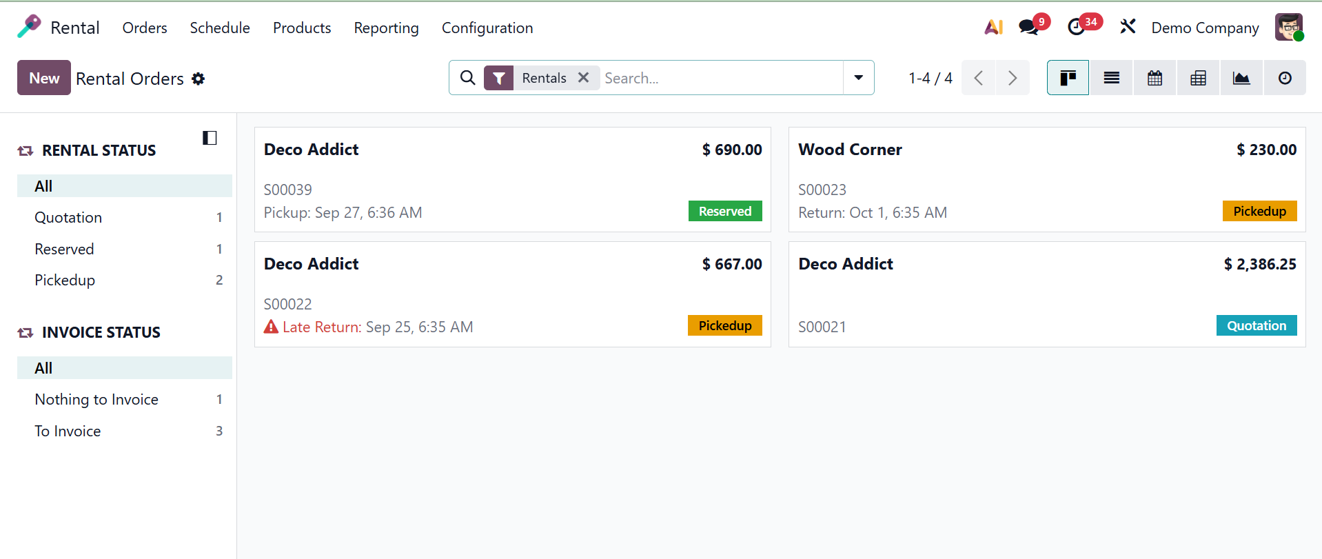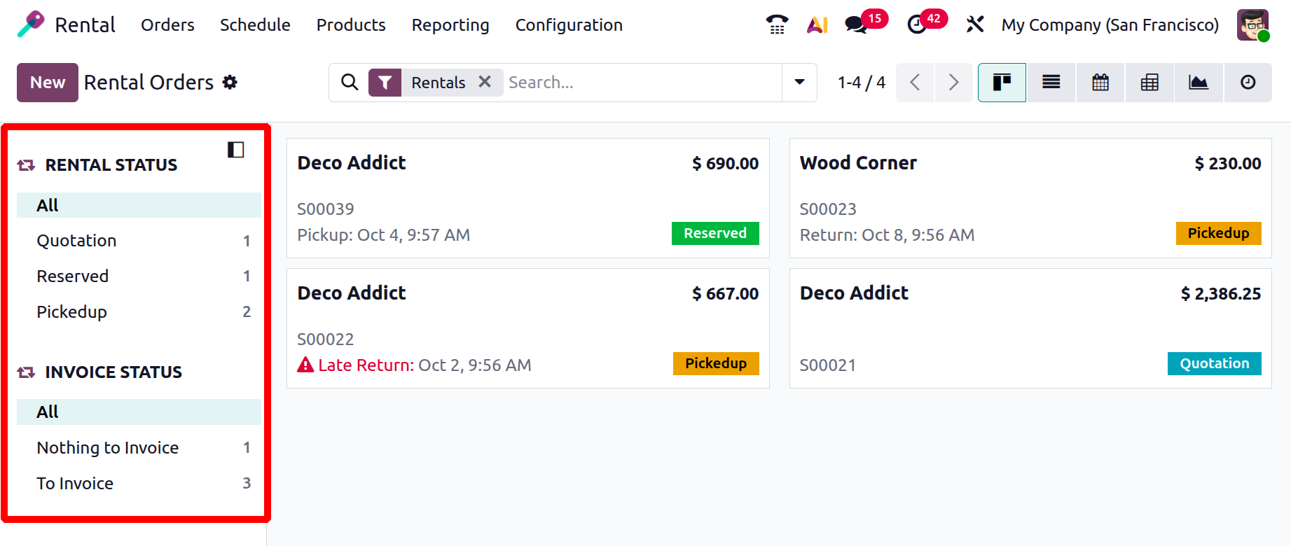 You'll learn more about the individual in charge of the rental products and those that have previously been produced. The Kanban view of the site displays the rental and invoice statuses on the left side of the screen. Rental statuses include Quotation, Confirmation, and Picked up, among others. Invoice status includes all, nothing to invoice, and to invoice. Here, you have some filters, and group by options as well.